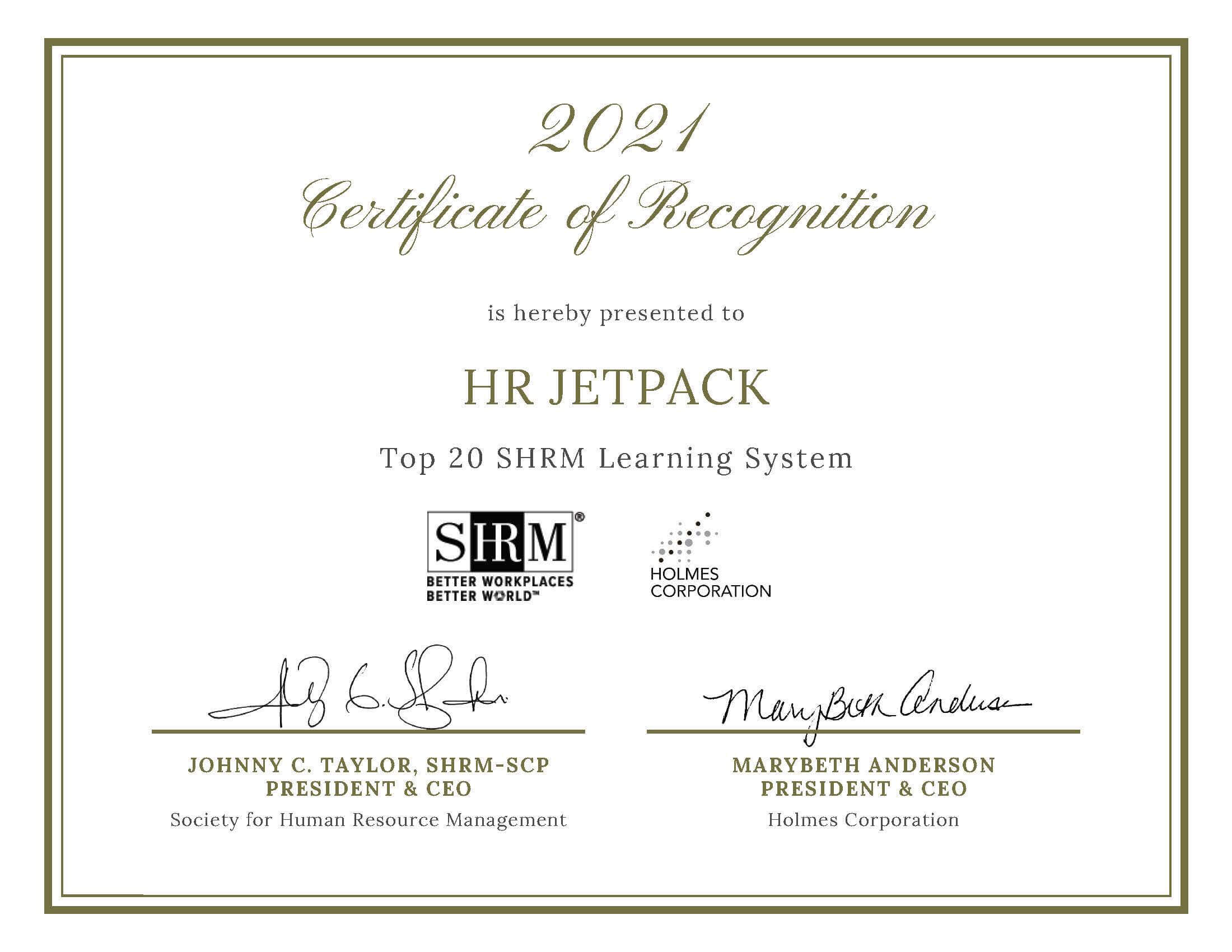 Known for their award-winning programs, HR Jetpack’s success comes from combining their team of experienced instructors with a fully customized and effective learning experience. The combination of high-quality HR training with the best platform technology available has made HR Jetpack a top choice for HR Professionals.